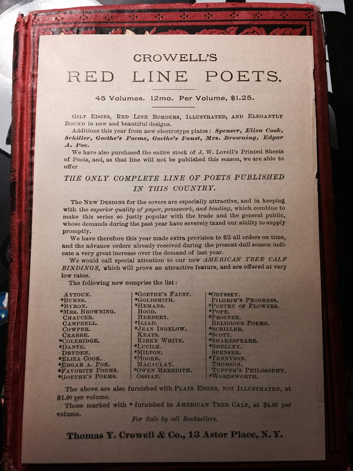Unfortunately, the book pictured isn’t even that. It’s an edition of Homer’s Iliad published by Thomas J. Crowell & Co. for their Red Line Poets series. I own copies of their editions of Percy Shelley’s and of Byron’s poetry. The photo to the right is of a flyer stuck inside my edition of Shelley that advertises the series. While it is a nineteenth-century edition, Crowell & Co. having published all 45 titles in the Red Line Poets series by 1882, they originally sold for $1.25 each and typically go for around $8.00 in used bookstores today. The Red Line edition of the Iliad sold for $4.00 at the time because it was bound in calfskin. It might really go for $1.00 in a garage sale, and it’s certainly attractive and would make a nice gift, but no one’s going to empty their bank accounts for one. You can read more about different Red Line Poets editions on this University of Iowa page.