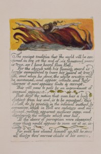 America a Prophecy is the first of Blake’s Continental Prophecies, so designated because their subjects involve America, Europe, Asia, and Africa. Some of the color copies were printed by Blake using his color printing method, in which different color inks were applied to different parts of the plate in different printing sessions. Blake would then touch up the image afterwards with pen and ink and/or watercolor washes. Written during the early period of Britain’s war with France, Blake placed himself in great danger of accusation of sedition for printing a work so sympathetic to the goals of the American Revolution while Britain was at war with revolutionary France. The work celebrates revolutionary energy during a period of great tumult in European history, particularly valorizing American revolutionaries with a number of references to U.S. founding fathers.