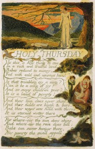 The “Holy Thursday” poems are companion poems, sharing the same title and subject while approaching them from different perspectives. The title “Holy Thursday” itself refers not to the Christian celebration of Maunday Thursday (the Thursday before Easter, also known as Holy Thursday), but Ascension Day (or the Feast of the Ascension) as it is celebrated by the Church of England. This day is celebrated the fortieth day after Easter, or on the Sunday following, to commemorate Christ’s ascension into heaven after the resurrection. St. Paul’s Cathedral held a service that day which included the poor children kept in London’s charity schools, who would be cleaned and dressed and then walked to the cathedral for services.