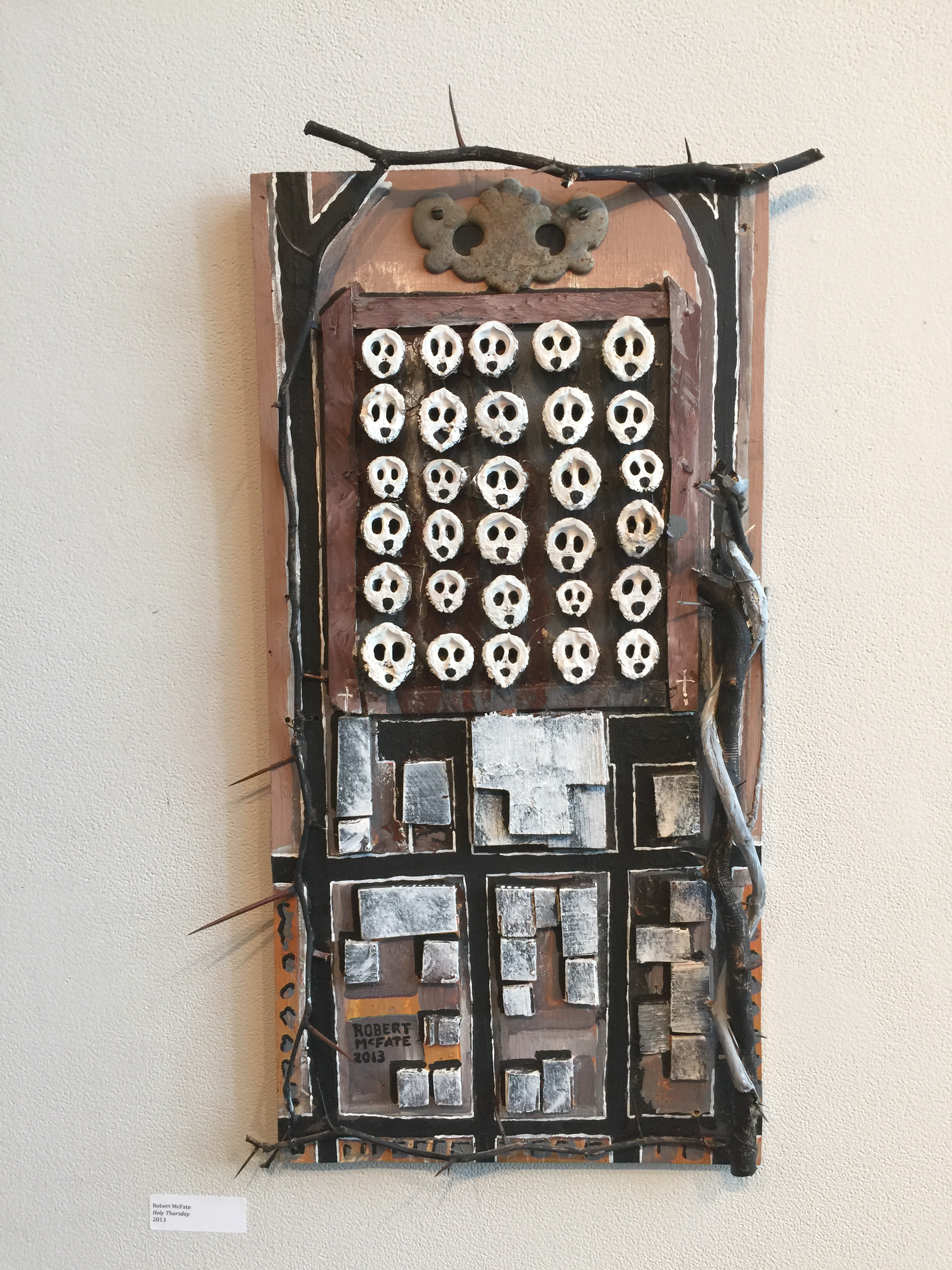 Blake’s Innocence version of the poem celebrates the day, describing the children with clean faces and uplifted hands as sounding like a choir of angels, ending with an encouragement to readers to care for poor children lest they “drive an angel” from their door. Blake’s Experience version of the poem, on the other hand, laments the existence of poverty, questioning the holiness of the sight of so many thousands of poor children in London alone. Robert McFate’s response appears to be an aerial view of the inside of a church during Holy Thursday, the children’s faces appearing as skulls looking up to heaven.